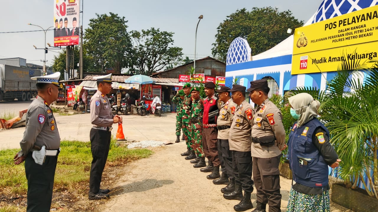 Kabupaten Bekasi – Personel gabungan TNI, Polri, dan instansi terkait melaksanakan pengamanan Pos Pelayanan Operasi Ketupat Jaya 2026 di Terminal Kali Jaya, Kecamatan Cikarang Barat, Kabupaten Bekasi, Sabtu (14/3/2026).