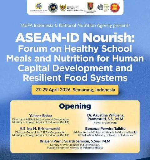 Jakarta – Badan Gizi Nasional terus memperkuat kerja sama regional di kawasan ASEAN dalam bidang gizi anak dan penyediaan makanan bergizi di sekolah melalui penyelenggaraan ASEAN-ID Nourish: Forum on Healthy School Meals and Nutrition for Human Capital Development and Resilient Food System. Kegiatan ini akan dilaksanakan pada 27–29 April 2026 di Semarang, Jawa Tengah.